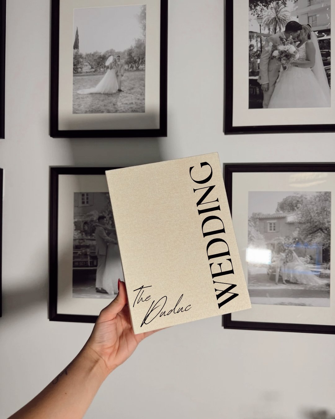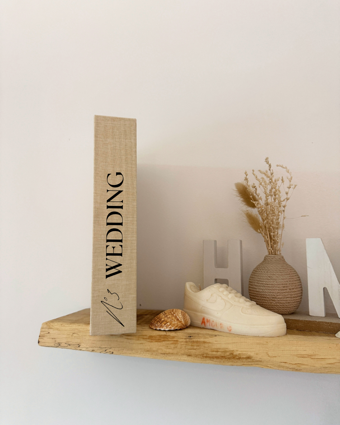 Chaque détail est personnalisé : le nom de famille sur la couverture, la date, le titre « Wedding » et la numérotation n°3 sur la tranche.