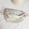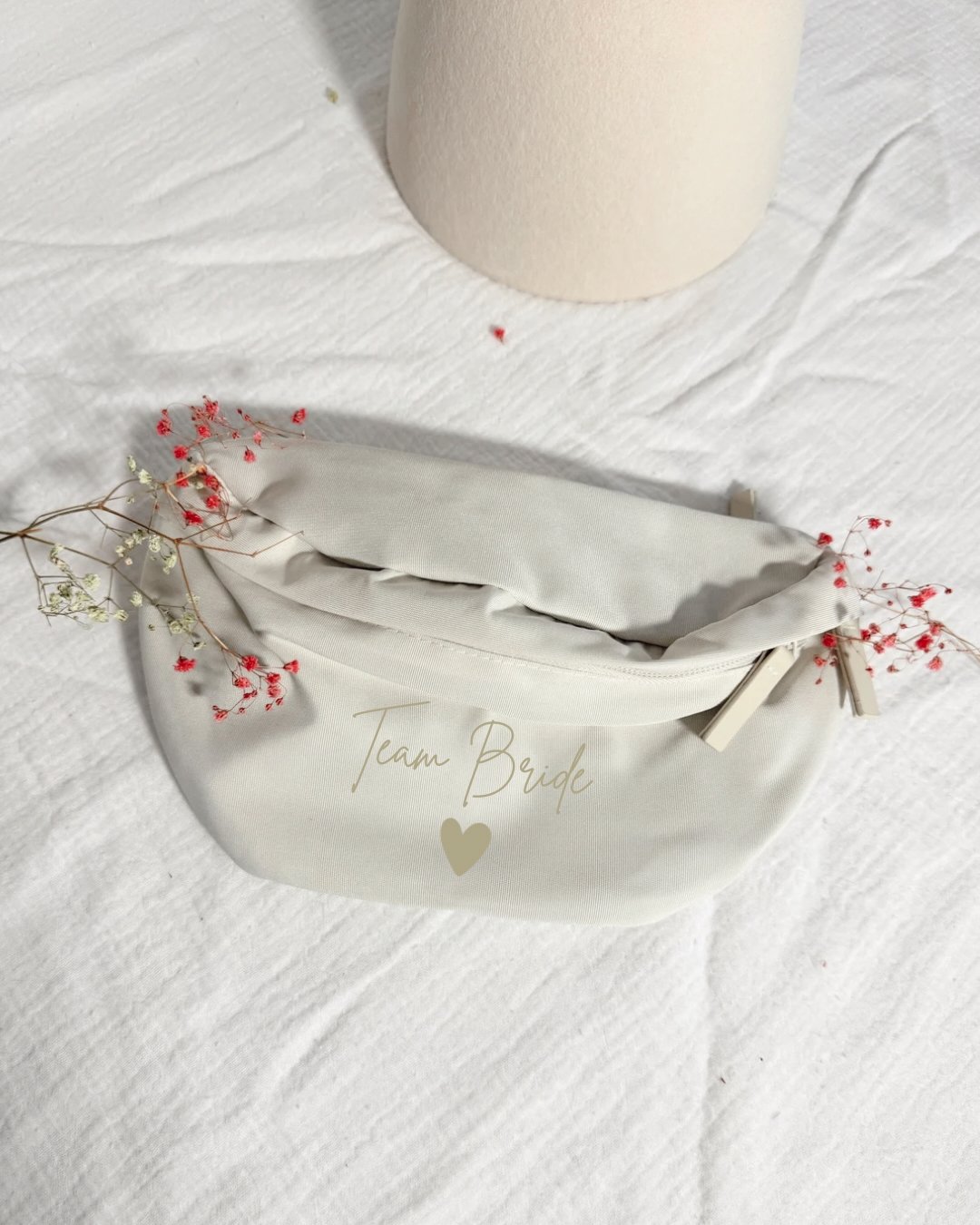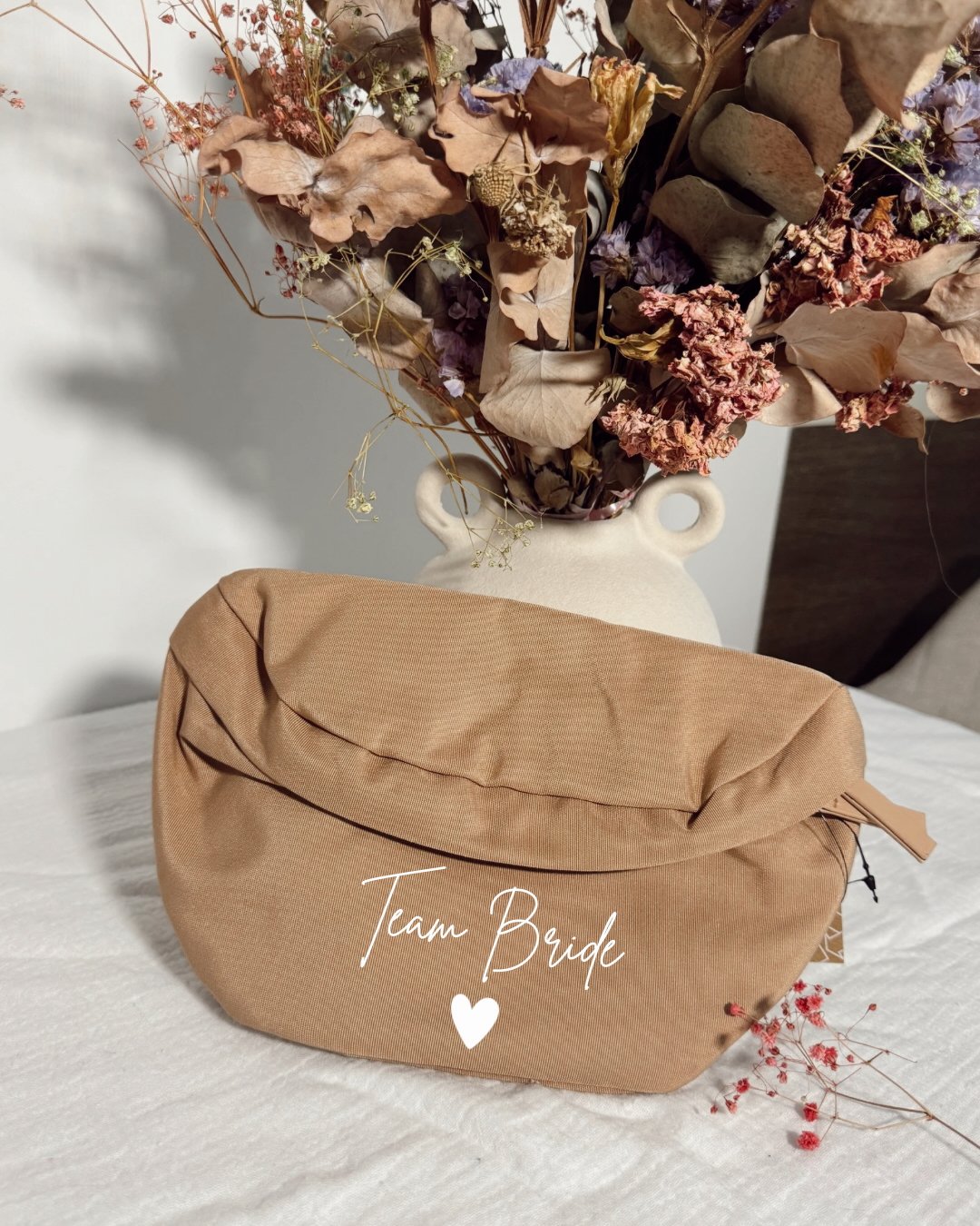 Réglable et confortable, elle se porte facilement en travers du torse (crossbody) ou à la taille. Elle permet d’avoir ses affaires à portée de main tout en affichant fièrement son appartenance à la team de la mariée.