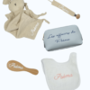 - Personnalisation : Prénom sur le doudou, le bavoir, l’accroche tétine, la brosse et la pochette