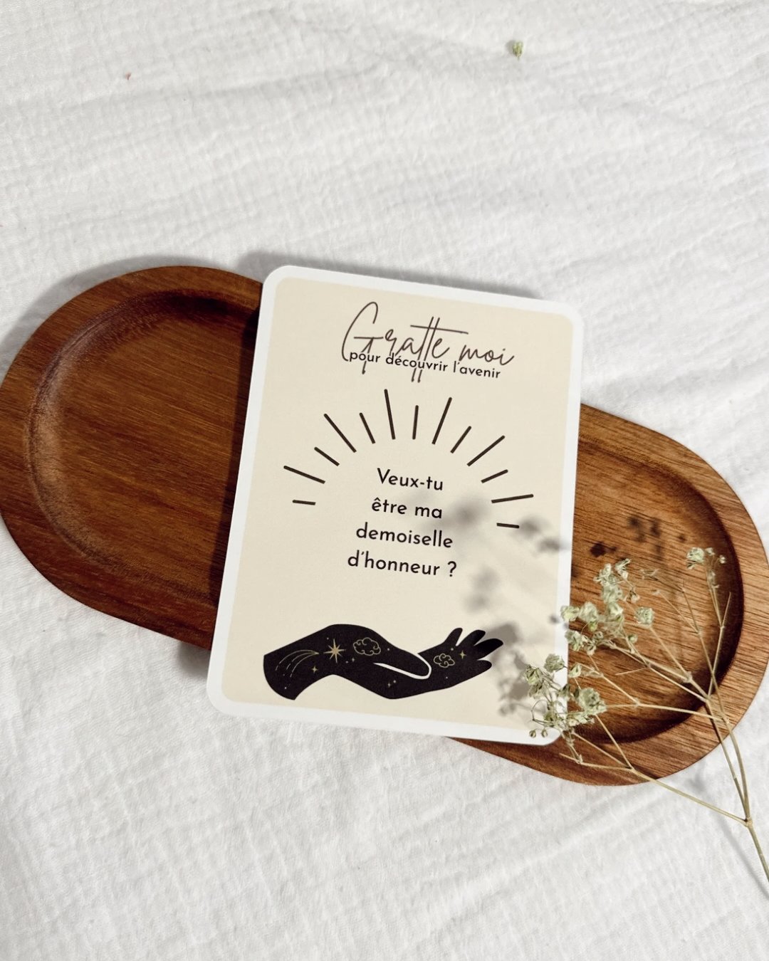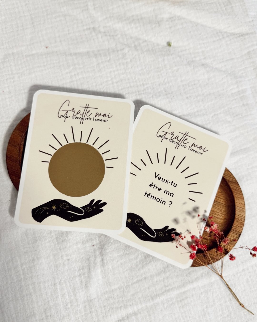 Sous la zone à gratter se cache un message tendre et symbolique, révélant avec émotion la grande nouvelle de votre union.