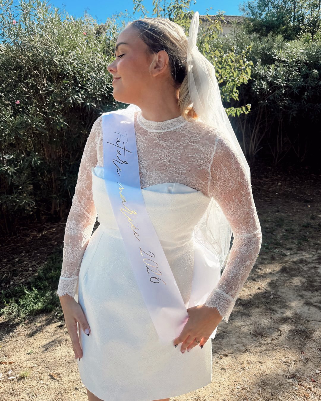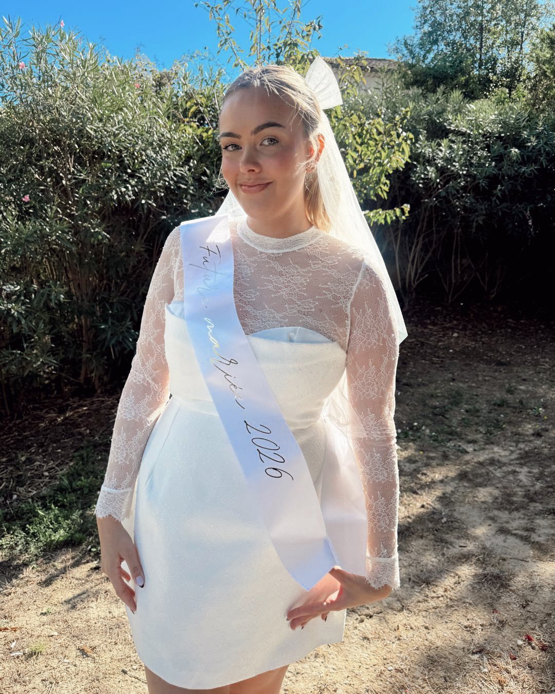 Indispensable pour mettre en valeur la reine du jour, notre écharpe blanche personnalisée pour mariée apporte une touche chic et festive à votre événement. Fabriquée dans un tissu satiné doux et fluide, elle se noue facilement sur l’épaule et met en lumière la future épouse lors de son EVJF ou le jour J.