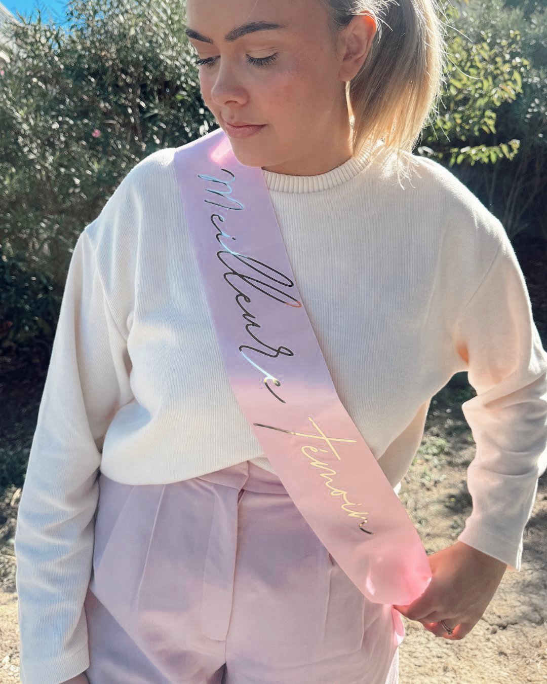 En satin doux et fluide, cette écharpe se porte fièrement et garantit une ambiance joyeuse et des photos souvenir pleines de complicité.