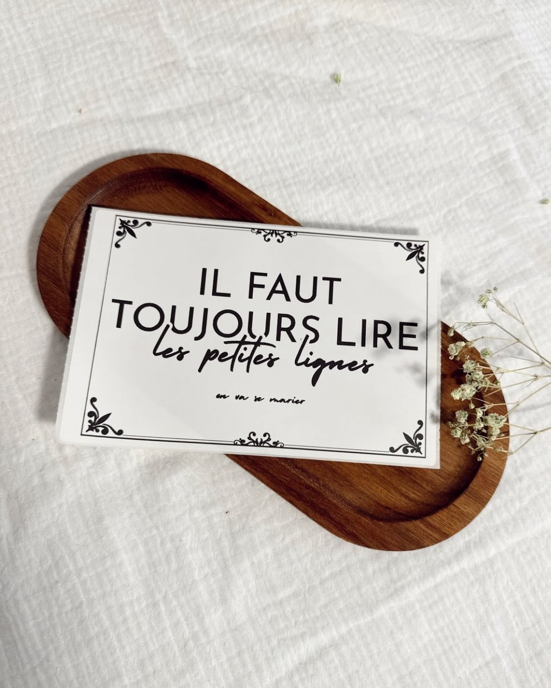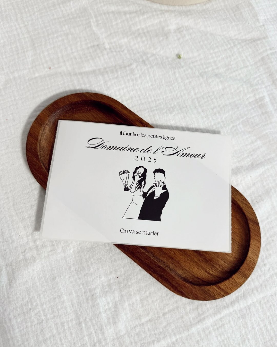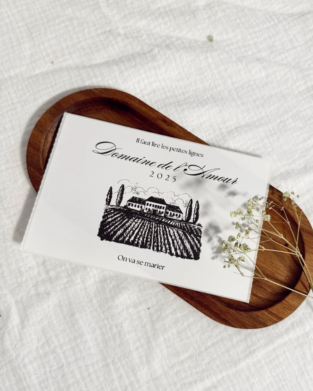 Chaque étiquette est créée et imprimée dans notre atelier, avec soin et délicatesse, pour refléter toute l’émotion de votre grand jour à venir. Vous avez le choix parmi plusieurs designs afin que votre annonce s’accorde parfaitement à votre univers et à votre style.