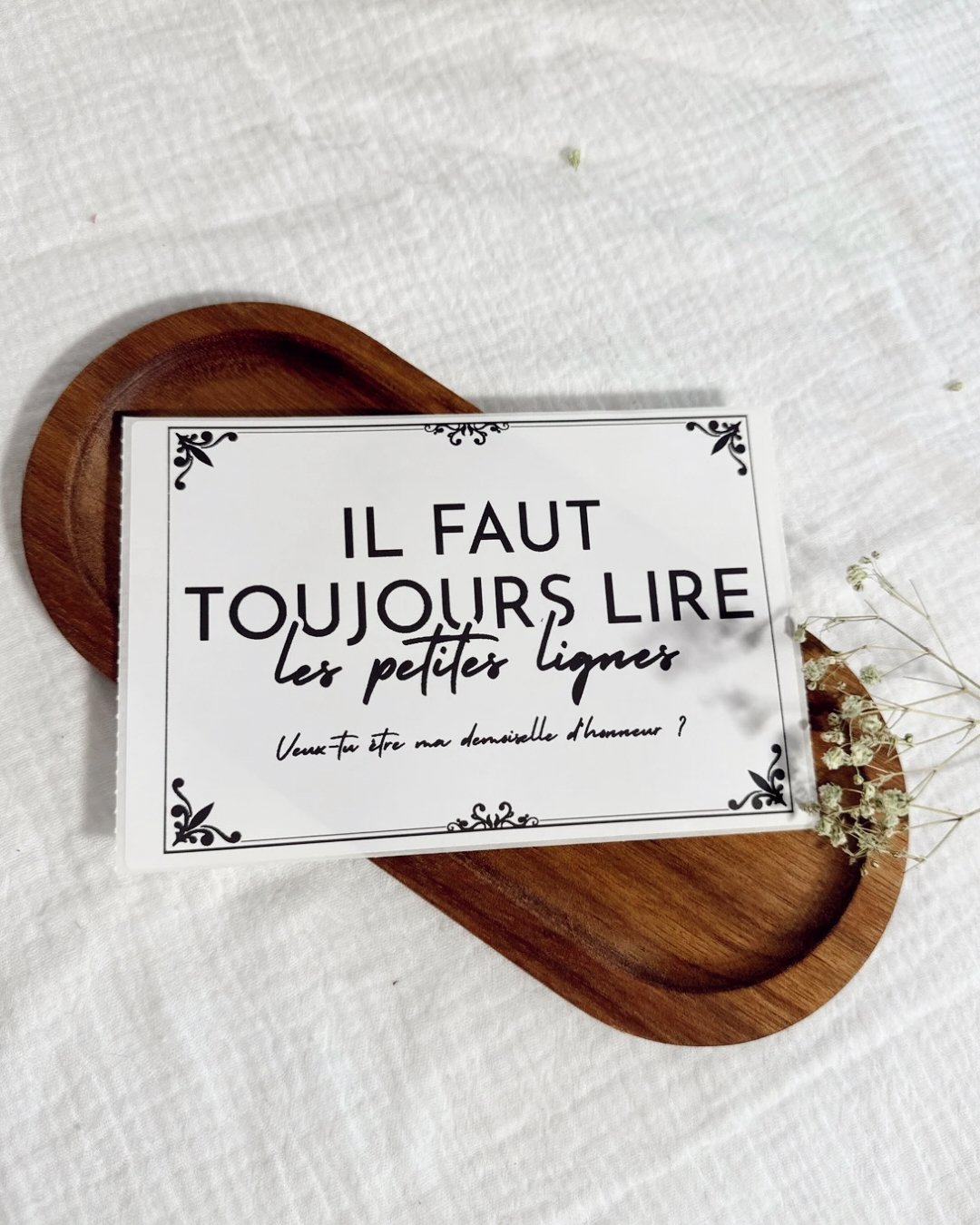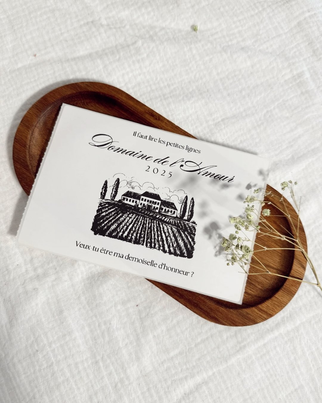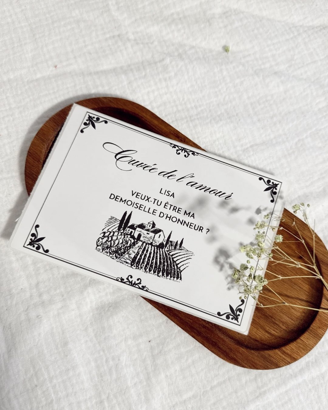 Imprimée avec soin dans notre atelier, chaque étiquette est pensée pour refléter votre complicité et rendre ce moment inoubliable.