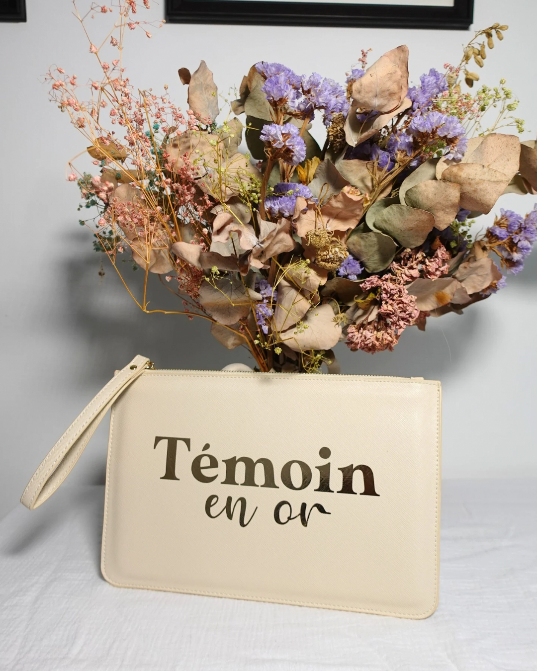 Déclinée en plusieurs coloris raffinés, elle s’adapte à tous les styles et devient rapidement l’accessoire favori de la témoin. Son inscription « Témoin en or » fait de cette pochette un souvenir unique et plein d’émotion, parfait pour remercier une personne si précieuse dans le mariage.